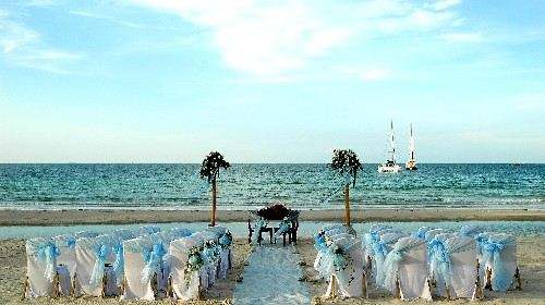 明媚的阳光,蔚蓝的大海,细软的沙滩,碧海蓝天在这里连成一片,一场简洁清新的海边婚礼已是当下最时尚的婚礼之一,这也可以当做是一场将婚礼与蜜月共同进行的仪式。